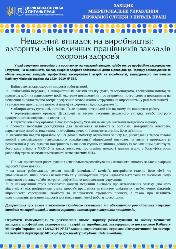 З метою підвищення рівня обізнаності медичних працівників щодо вимог законодавства у частині дій при зверненні потерпілих з посиланням на нещасний випадок на виробництві, забезпечення об’єктивності та своєчасності проведення розслідування нещасних випадків, виявлення випадків прихованого травматизму, звертаємо увагу на дотримання алгоритму дій медичних працівників закладів охорони здоров’я у разі звернення потерпілого з посиланням на нещасний випадок та/або гостре професійне захворювання (отруєння) на виробництві.
